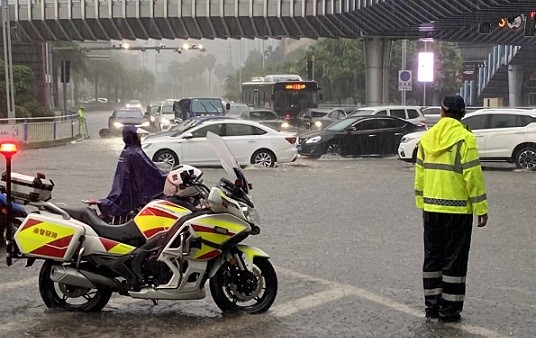华龙网-新重庆客户端讯(记者 周盈)今(18)日,重庆市气象台发布暴雨黄色预警信号,重庆多地出现暴雨,并伴有雷电、阵性大风等强对流天气。受强降雨和强对流天气的影响,九龙坡区部分道路积水影响正常通行,重庆市公安局九龙坡区分局民辅警迅速与投入到雨灾隐患、巡查排险、疏导交通等工作中。