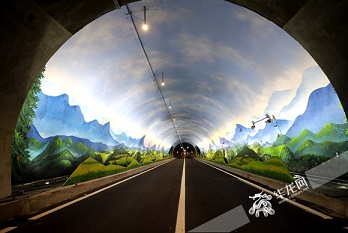 在壁画前,还有山形3D立体前景,结合光影变化,预留音响设备,今后将模拟鸟鸣声与环境融合,形成声光电4D景观,这也是全国首条4D景观高速公路隧道。